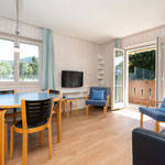 L'appartement comprend un salon/salle à manger avec cuisine ouverte, accès au balcon, deux chambres à coucher et une douche/WC. L'appartement comprend un compartiment de cave et l'utilisation commune de la buanderie et du local à skis. Place dans le garage.